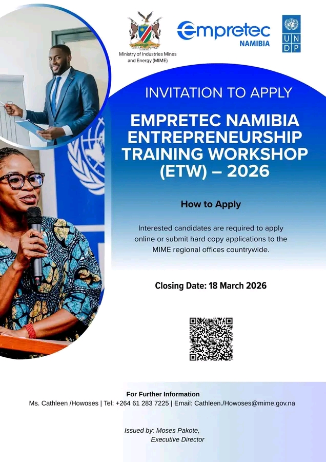 EMPRETEC Namibia Opens Applications for 2026 Entrepreneurial Training Workshop. EMPRETEC Namibia has announced a call for applications to its flagship Entrepreneurial Training Workshop (ETW), scheduled to take place from March to April 2026 across all regions of the country.