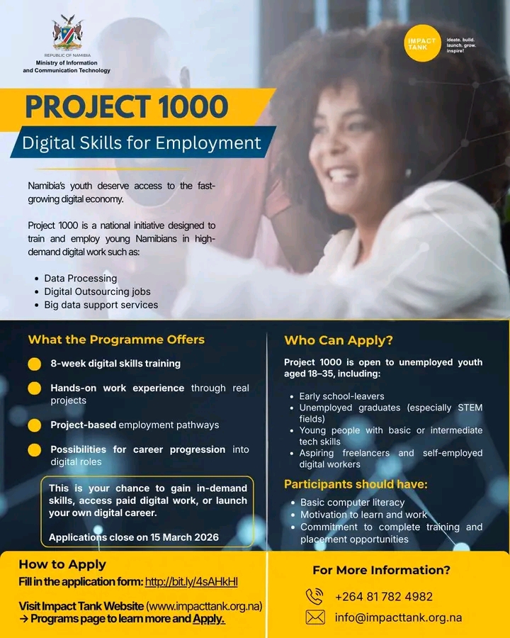 Project 1000 Launches to Equip Namibian Youth with Digital Skills. The Ministry of Information and Communication Technology has announced the launch of Project 1000 – Digital Skills for Employment, an initiative aimed at empowering unemployed youth with critical digital competencies to thrive in the modern economy.